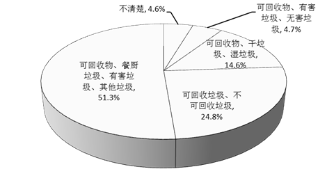 按照當前的分類要求,生活垃圾主要有“四分類”(可回收物、餐廚垃圾、有害垃圾、其他垃圾),調查為了解受訪居民對現行分類要求的知曉情況,在設置問題選項時混入了“可回收垃圾、不可回收垃圾”“可回收物、干垃圾、濕垃圾”等干擾項。