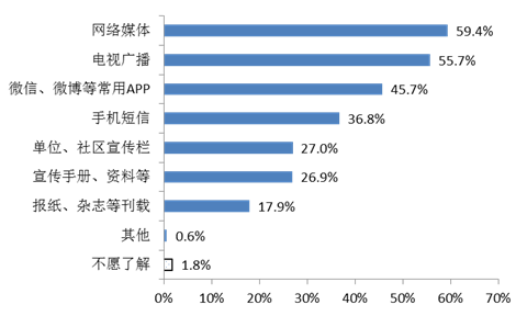 對于獲取生活垃圾分類相關知識的主要途徑,受訪居民選擇“網絡媒體”和“電視廣播”的比例最高,分別為59.4%、55.7%。此外,希望通過“微信、微博等常用APP”“手機短信”“單位、社區宣傳欄”和“宣傳手冊、資料”等途徑來了解垃圾分類知識的比例也較高(此題為多選,相加不等于100%,詳見圖4)。